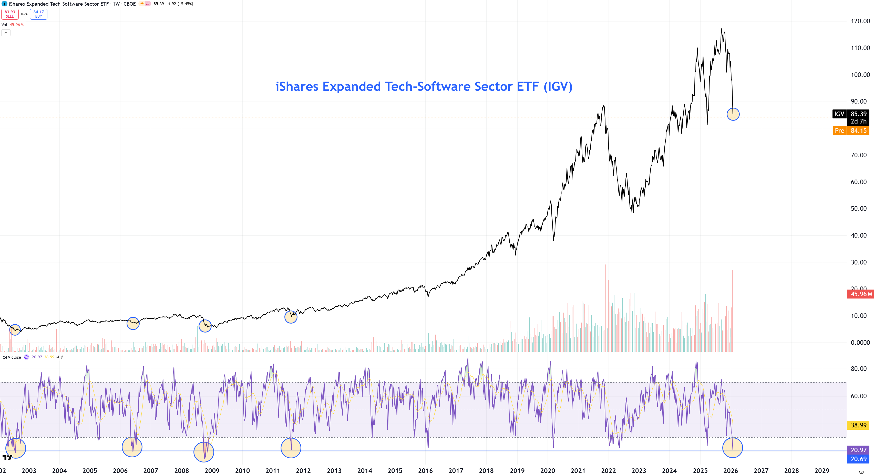 Som contrarian kikar jag gärna på sektorer och aktier som faller i jakt på nästa köpläge. Ser vi rent tekniskt på den amerikanska mjukvarusektorn noteras nu RSI(9) på 20,97 i veckoperspektivet. Det indikerar en brutalt översåld marknad och har endast inträffat fyra gånger historiskt sedan 2001 och inte sedan 2011.