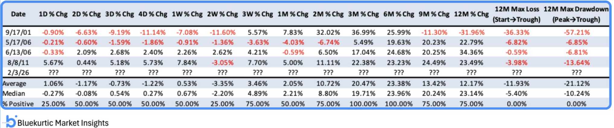 Tabellen nedan från Bluekurtic Market Insights bygger på daglig data och jag visar veckoperspektivet i grafen ovan, men det intressanta är hur historien spelat ut de kommande 3-6 månaderna när vi sett detta pressade läge inom mjukvarusektorn. Utfallet på 0-2 veckor är volatilt och präglas inte sällan av fortsatta nedgångar, men blickar vi ut 3-6 månader fram i tiden har sektorn stått betydligt högre med genomsnittliga uppgångar om +20,47 % – 23,38 % i samtliga av de tidigare fyra tillfällena. Dags att börja kika på Microsoft för året efter -26% sedan i oktober? Det bör inte vara helt fel!