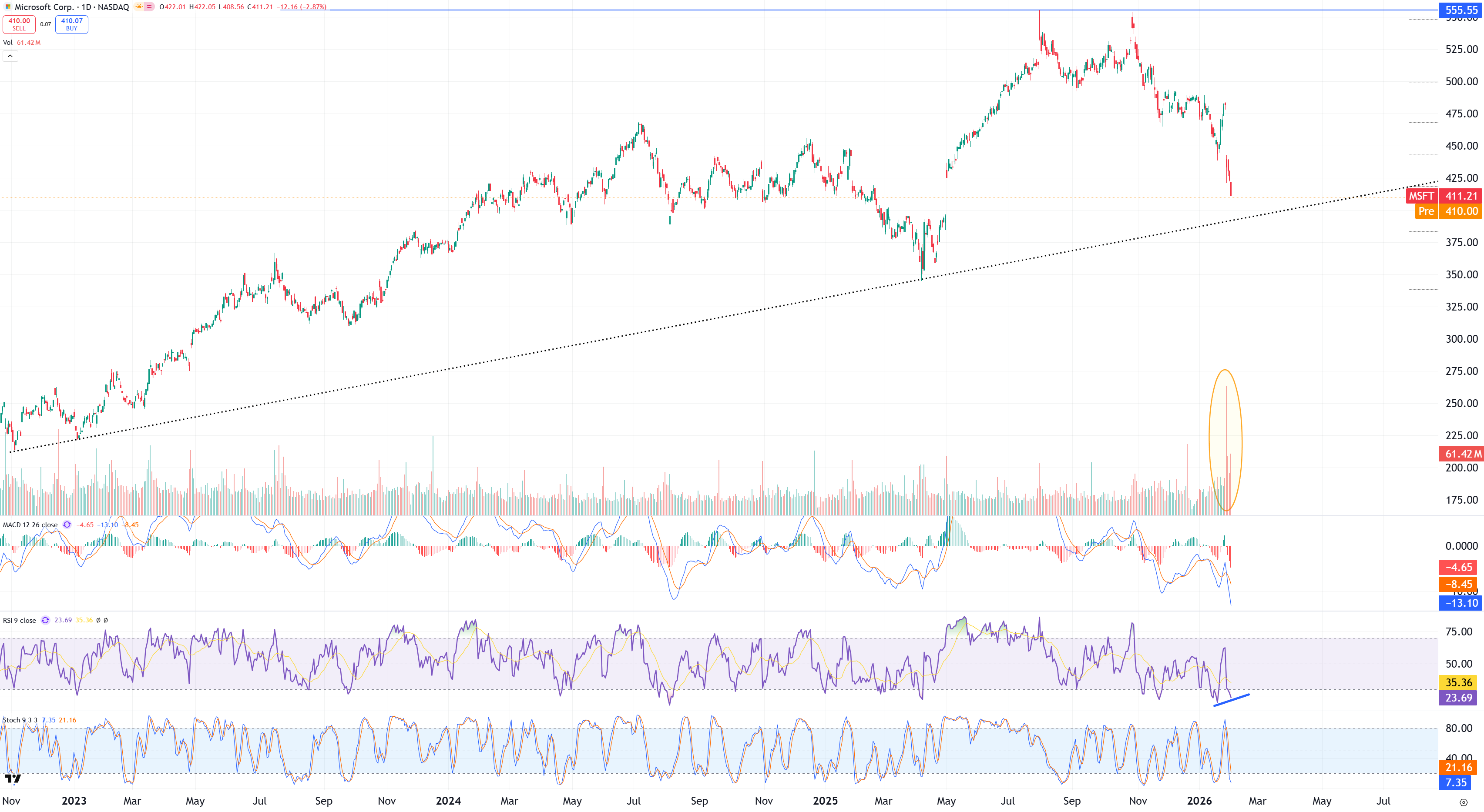 Bland enskilda aktier har Microsoft den största indexvikten (9 %) i IGV ETF:n ovan. I Microsoft såg vi en tydlig volymexplosion i samband med torsdagens rapport samtidigt som volymen avtagit sedan dess. Trendlinjen från botten 2022 är intakt och vi ser tendenser till positiva divergenser i RSI i daily chartet. Visst kan nedgången fortsätta i närtid om säljtrycket i sektorn består, men jag blir förvånad om aktien etablerar sig under 395-400 usd och tror att vi snarare står inför markanta uppgångar under våren!