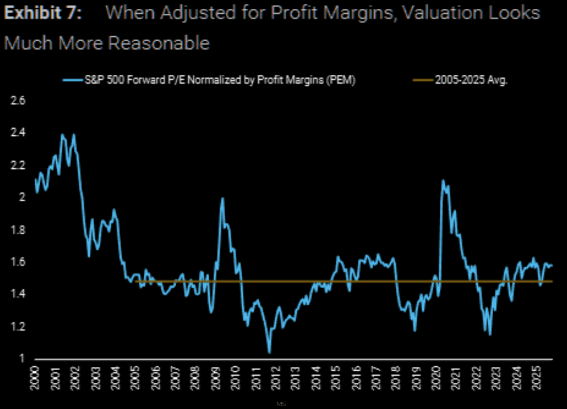 - Värderingarna framstår som mindre ansträngda: Justerar man S&P 500:s framåtblickande P/E-tal för marginaler ligger det ungefär 35 % lägre än toppnivåerna under techbubblan från 99/00.