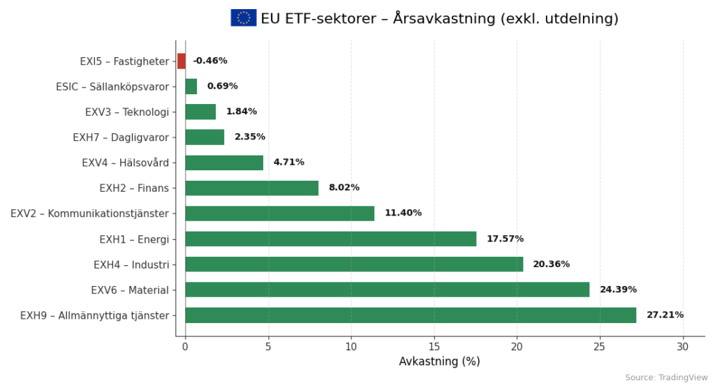 Är fastighetsbolagen bara svaga i Sverige? Nej, faktiskt inte. Även i Europa går de svagt, som vi kan se i detta diagram från min förra artikel, årssammanfattningen för 2025. Faktum är att fastigheter är den sektorn som hade sämst årsavkastning i Europa under förra året. Detta är alltså en trend över större delar av världen, inte bara Sverige.