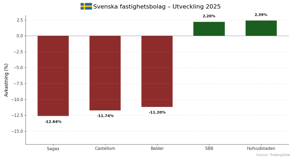 Hela branschindexet på OMX Stockholm och utvecklingen för bolagen de senaste åtta åren har varit mycket varierad. Många fina år med stark nyproduktion, stark svensk ekonomi och låga räntor. Det stora raset kom under 2022 och chockade marknaden. En reaktionsstuds under 2023 och två svaga år 2024–2025. Under 2025 var fastighetssektorn även en av de svagaste sektorerna på Stockholmsbörsen. Diagram med data från TradingView.
