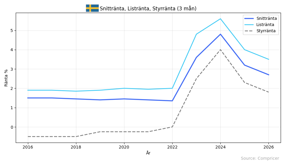 Sedan börjar inflationen falla och under mitten av 2024 började Riksbanken att sänka styrräntan gradvis och i dagsläget befinner vi oss på 1,75%. Grafen nedan visar snitträntan, listräntan och styrräntans förändringar från 2016 till nutid (3 mån bindningstid), data från Compricer.