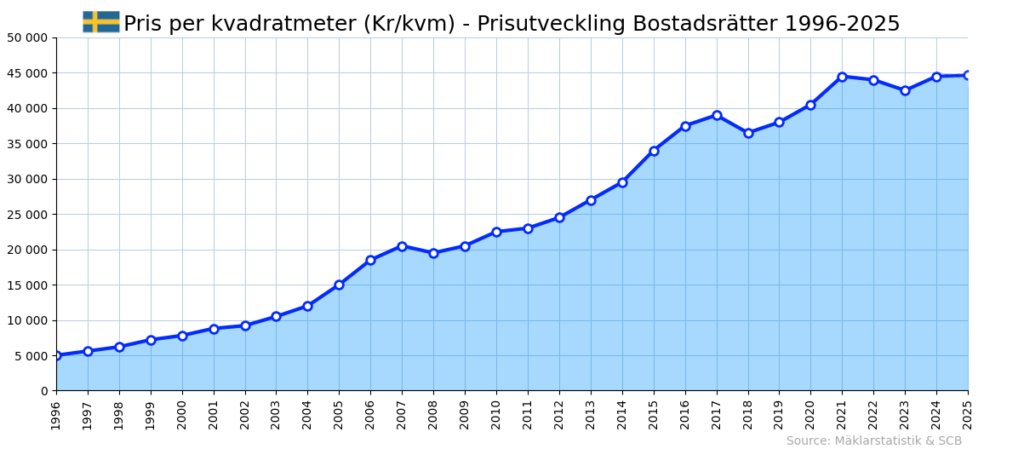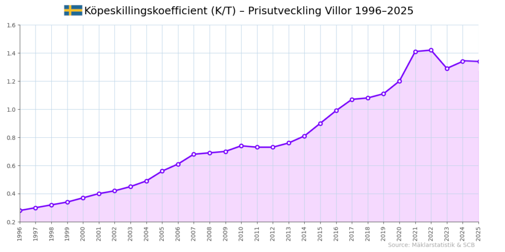 De två diagrammen här nedan visar prisutvecklingen för villor och bostadsrätter från 1996–2025. K/T visar förhållandet mellan villors köpeskilling (pris) och taxeringsvärdet, används ofta för att mäta prisutvecklingen. Kr/kvm används för att mäta priset per kvadratmeter på bostadsrätter och visar hur mycket varje kvadratmeter kostar. Data från Mäklarstatistik & SCB.