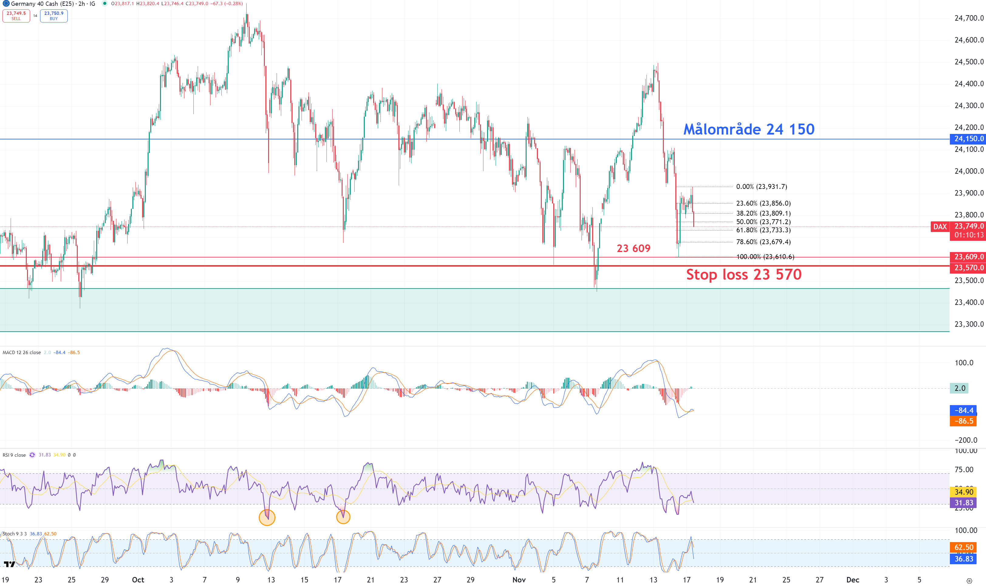 Vi väljer att gå lång här igen med en stop loss strax under förra veckans lägsta nivå i index (23 609). Vi sätter 23 570 som stop loss (-0,85 %) och ser 24 150 som målområde (+1,55 %). Som alltid sätts stop lossen i den handlade produkten.