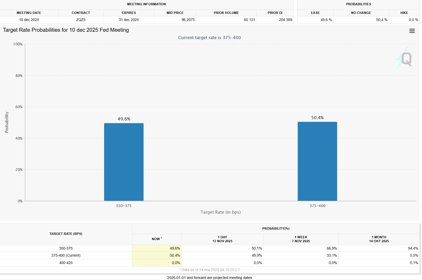 Ser vi till Fed har vi fått en del hökaktiga kommentarer från ledamöter de senaste dygnen, vilket fått marknadens prissättning av räntesänkningen i december att svänga om till 50/50 från tidigare 67/33. Det ska också jämföras med att marknaden såg 94% sannolikhet för -25bps i december så sent som för en månad sedan. Att vi nu har 50% sannolikhet för en sänkning sätter såklart sina spår i marknaden med ökad oro och större volatilitet, vilket vi också ser just nu.