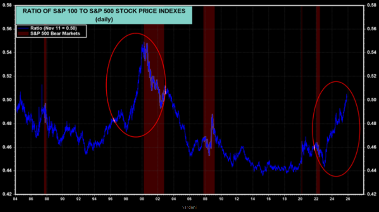 Vi börjar nu se en del prognoser för 2026 och Yardeni Research ger sin syn här: “Vi siktar fortfarande på 7 700 vid slutet av nästa år. Det är vårt basscenario och ser 50% sannolikhet för detta. Vi bedömer att det finns 30 % chans för en melt-up och 20 % risk för en melt-down fram till slutet av nästa år. Vi följer uppgångsscenariot genom att övervaka förhållandet mellan S&P 100 och S&P 500. Den snabba ökningen i detta förhållande under de senaste åren påminner om det som hände under IT-bubblan i slutet av 1990-talet.”