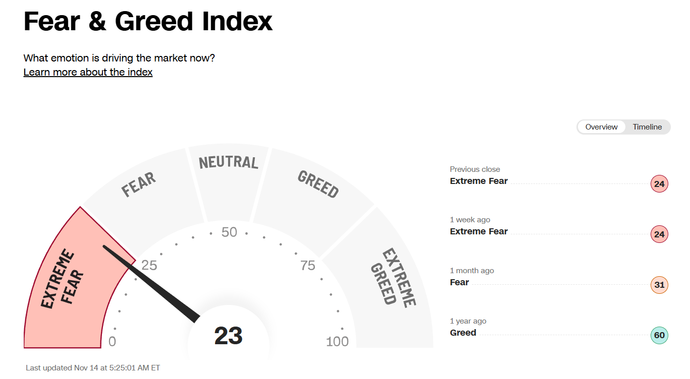 Ser vi till sentimentet på marknaden noteras vi fortsatt i Extreme Fear och där AAII Sentiment Survey denna vecka visar på en ordentlig uppgång i andel Bears till 49,1%. En andel på över 49% har vi inte sett sedan mitten på september.