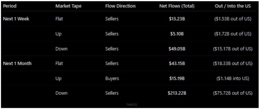 Den senaste tidens ökade volatilitet gör att CTAer väntas vara säljare i alla marknadsregimer under nästa vecka enligt nedan tabell från Goldman Sachs. Även på längre sikt är det stora “deltat” på nedsidan då strategierna är så gott som fullallokerade efter en stark höst. Nivåer på S&P 500 som Goldman Sachs ser som trigger för större säljflöden: Short term: 6705, Medium term: 6419, Long term: 5968.