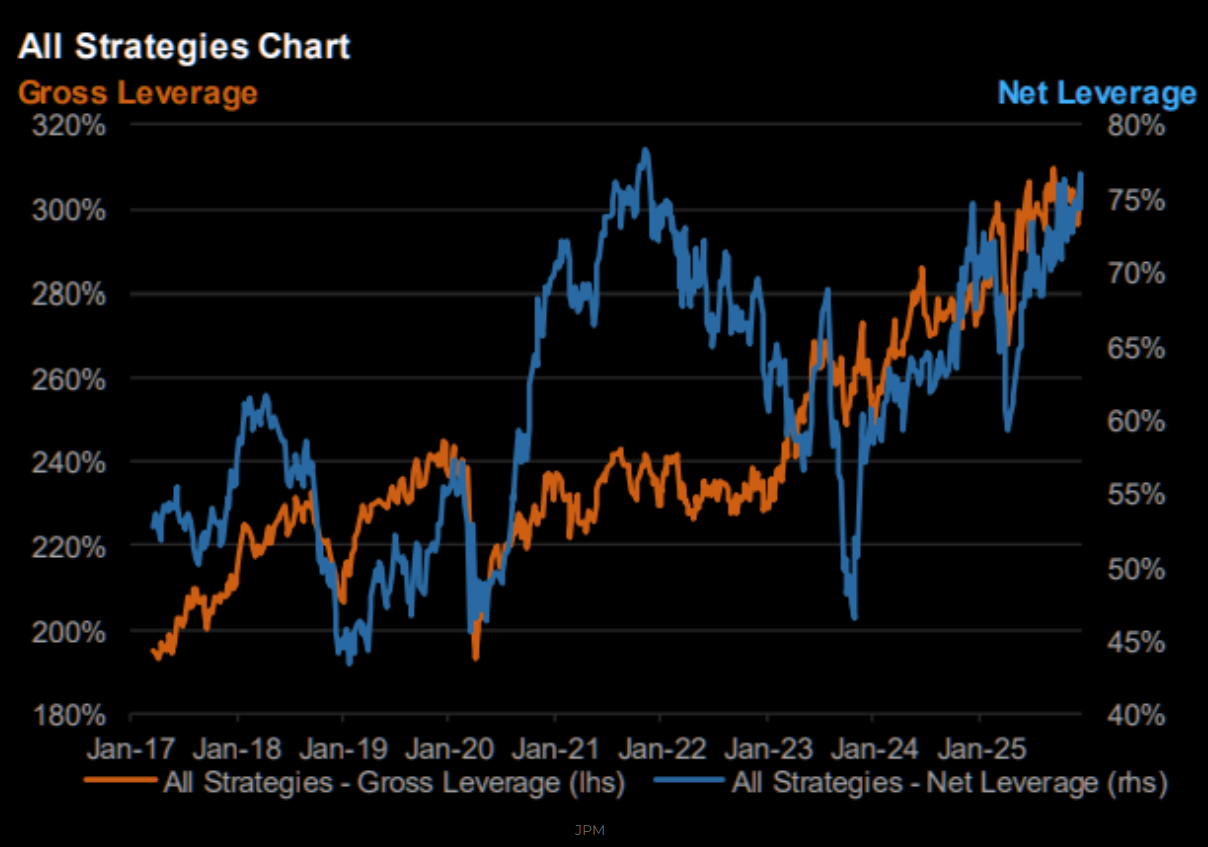 - Hedgefondernas brutto- och nettobelåning ligger i den 90–100:e percentilen jämfört med långsiktig historik, både totalt och inom aktiestrategier long/short – nivåerna är ansträngda.