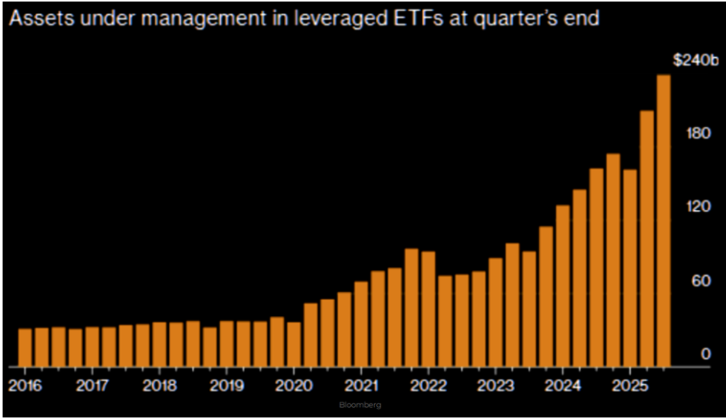 Investerare har nu plöjt in 239 miljarder dollar i ETF:er med hävstång, vilket är den högsta nivån någonsin. Hävstång fungerar som bekant åt båda håll.
