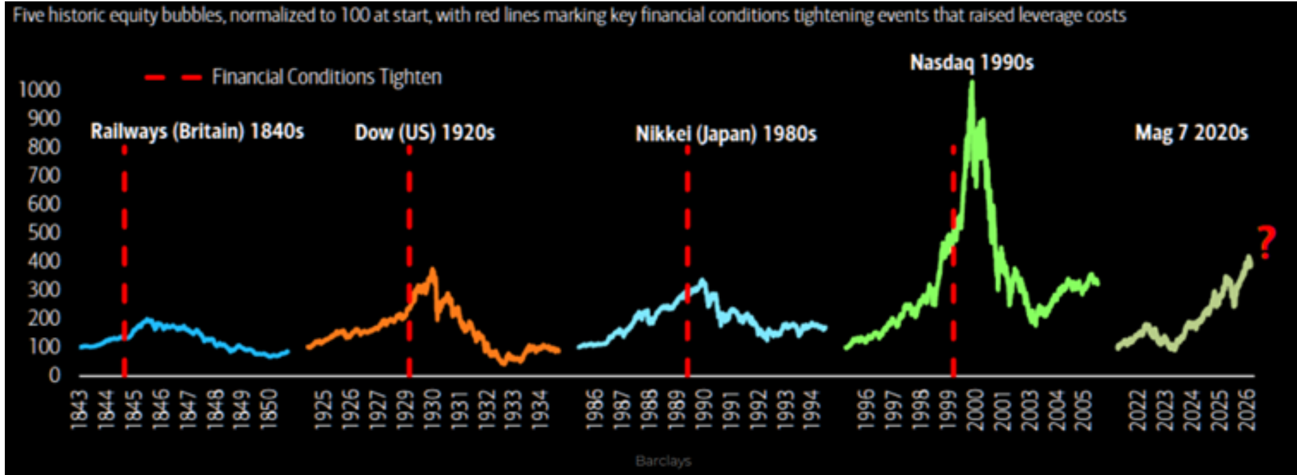 Stora bubblor på de globala aktiemarknaderna under de senaste cirka 180 åren har alla föregåtts av en åtstramning av de finansiella förhållandena innan de sprack. Just nu har vi en förnyad expanderande penningpolitik (här).