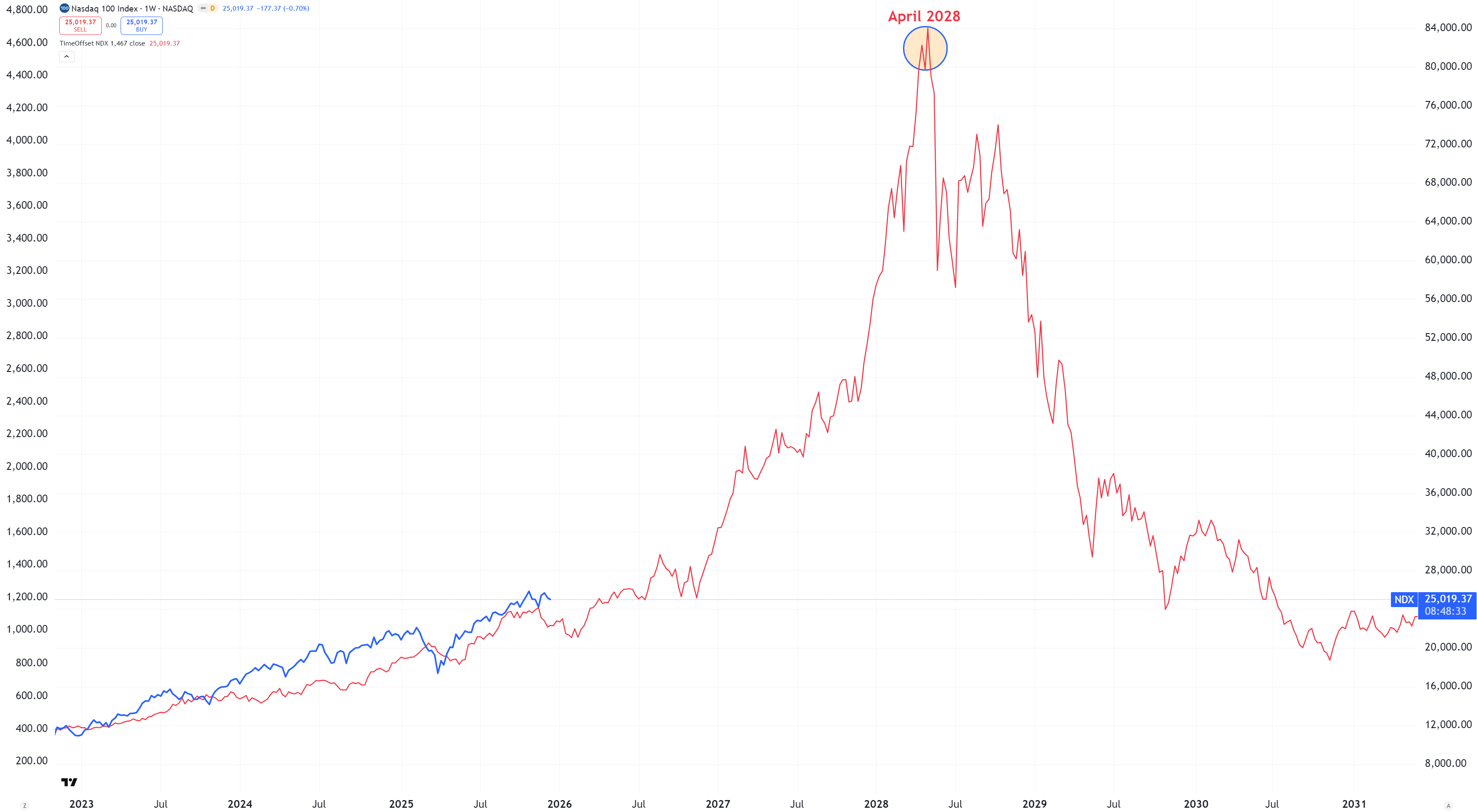 Utvecklingen på Nasdaq 100 när man jämför lanseringen av Netscape 19 oktober 1994 och lanseringen av ChatGPT den 30 Nov 2022. Är detta bara början?