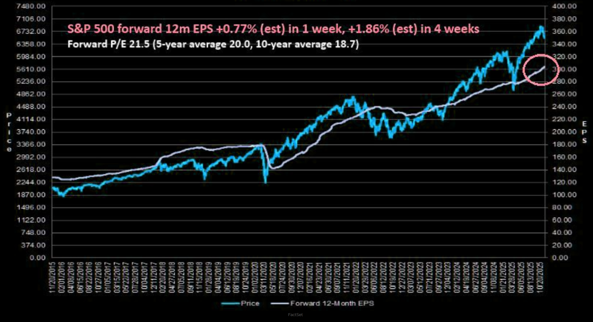 Förra veckan steg 12 månaders framåtblickande vinstestimat med +0,77% och är därmed upp +1,86% den senaste månaden. Framåtblickande P/E-tal handlas nu på 21,5x, vilket är 7,5% över det senaste 5-årssnittet och 15% över snittet de senaste 10 åren. Ser vi mot de senaste 5 åren är därmed nuvarande värdering svår att klassa som en ordentlig bubbla.
