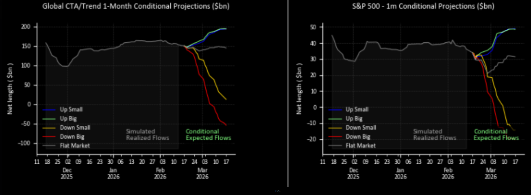 Systematiska strategier så som CTA:er är inte längre helt fullinvesterade i aktieexponering, men fortfarande ligger det stora deltat/förändringen på nedsidan då de kommer vara stora säljare både på 1 vecka och 1 månad i potentiellt fallande börser. Dessa strategier agerar helt utan känslor och säger den interna modellen sälj, kommer de att sälja oavsett nivå. Viktigt att komma ihåg!