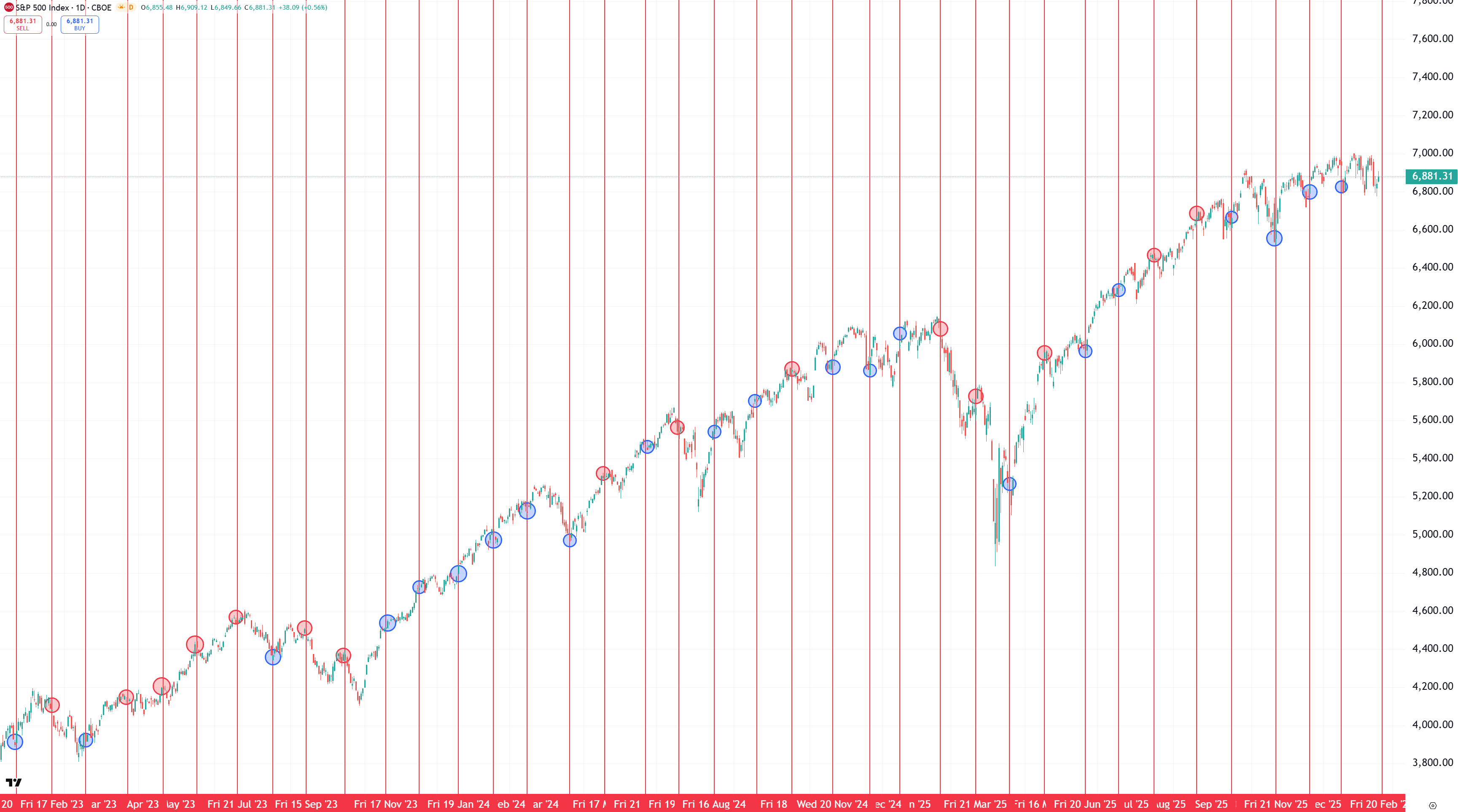Inte sällan utgör optionslösen en temporär trendvändning i marknaden. Grafen visar S&P 500 med alla optionslösen sedan jan 2023 där blå markeringar innebär bottennoteringar och antingen en trendvändning uppåt eller en förstärkt redan uppåtgående trend efter optionslösen. Röda markeringar visar på temporära toppar.