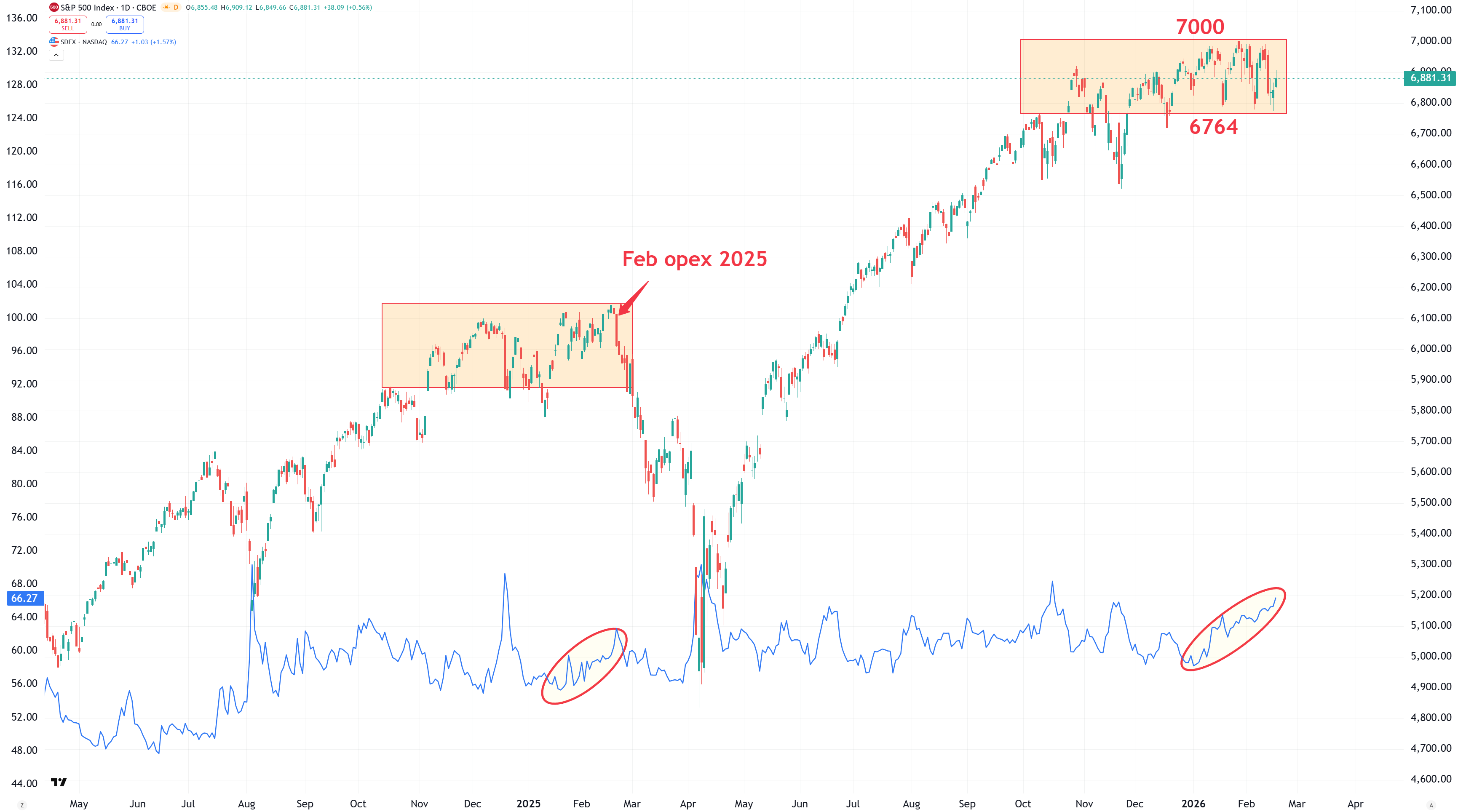 S&P 500 fortsätter att handlas i en tajt konsolidering mellan 7000 och 6764. Bevaka dessa två nivåer noga! En etablering ovan 7000 och vi kan inom ett par månader ser nivåer upp mot 8000-nivån, medan om 6764 tas ut med styrka i närtid och vi bör hyggligt fort känna på 6500-nivån. Notera likheten mellan 2026 och mönstret 2025 där vi då liksom nu såg en konsoliderande marknaden och ett stigande SDEX-index in mot optionslösen i februari! Det betyder på ren svenska att investerare betalar upp för säljoptioner just nu.