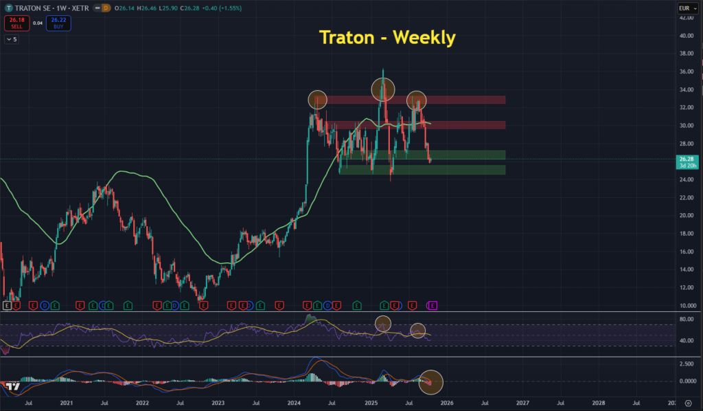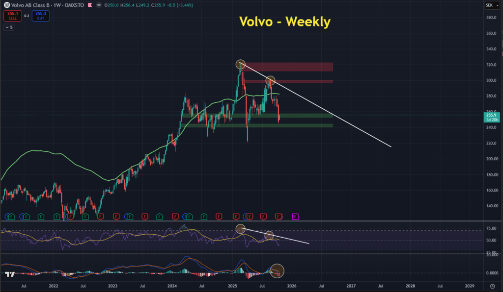 Utvecklingen i år har varit svag, mycket påverkad av osäkerheten kring de senaste amerikanska tullarna, men även på grund av minskad efterfrågan för både lastbilar och bussar. Detta återspeglas på aktiekursen, så här ser veckograferna ut för både Volvo och Traton. Grafer från TradingView.