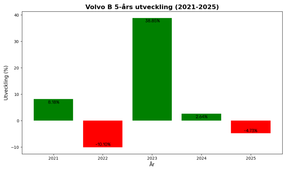 Vi ser stora skillnader där till exempel Traton underpresterar kraftigt under 2022 samtidigt som Volvo står upp bättre eftersom deras diversifiering runt om i världen klarade tillfälliga störningar i leveranskedjor bättre. När sedan leveranskedjorna stabiliserades under 2023/2024 så överpresterade i stället Traton marknaden rejält, eftersom de kunde börja leverera fler fordon i snabbare takt än Volvo. Det är en volatil industri där förutsättningar skiftar från dag till dag.