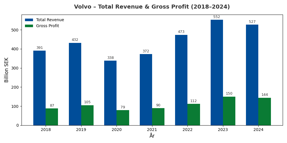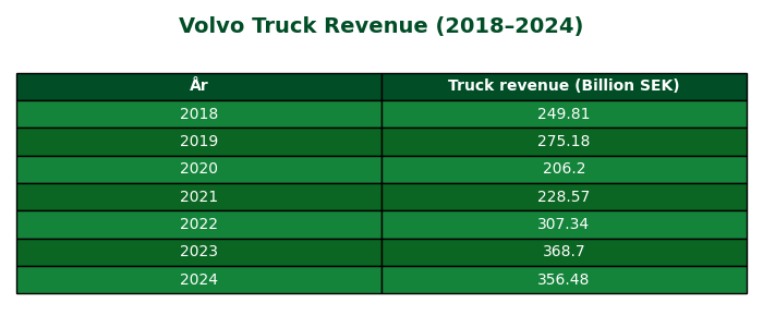 Den stora anledningen till varför Volvo stannat av just nu är på grund av en avtagande försäljning och efterfrågan av lastbilar, detta är deras största inkomstkälla. Efterfrågan har minskat på grund av en svagare makroekonomi, där framför allt minskad aktivitet och förseningar inom byggsektorn påverkat mest. I den senaste rapporten förra veckan nämndes återigen att orderingången av lastbilar fortsatt överraskar negativt inför 2026 och försiktigheten kring bolaget är kvar. Här kan vi se från 2018 till 2024 på just omsättningen för lastbilssegmentet. Tabeller med data från TradingView.